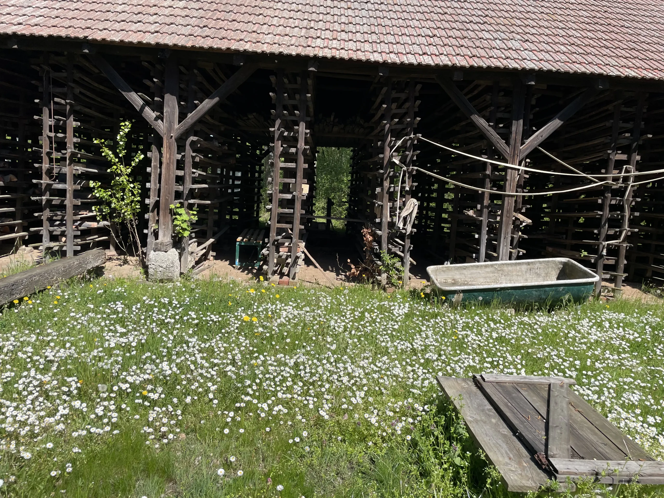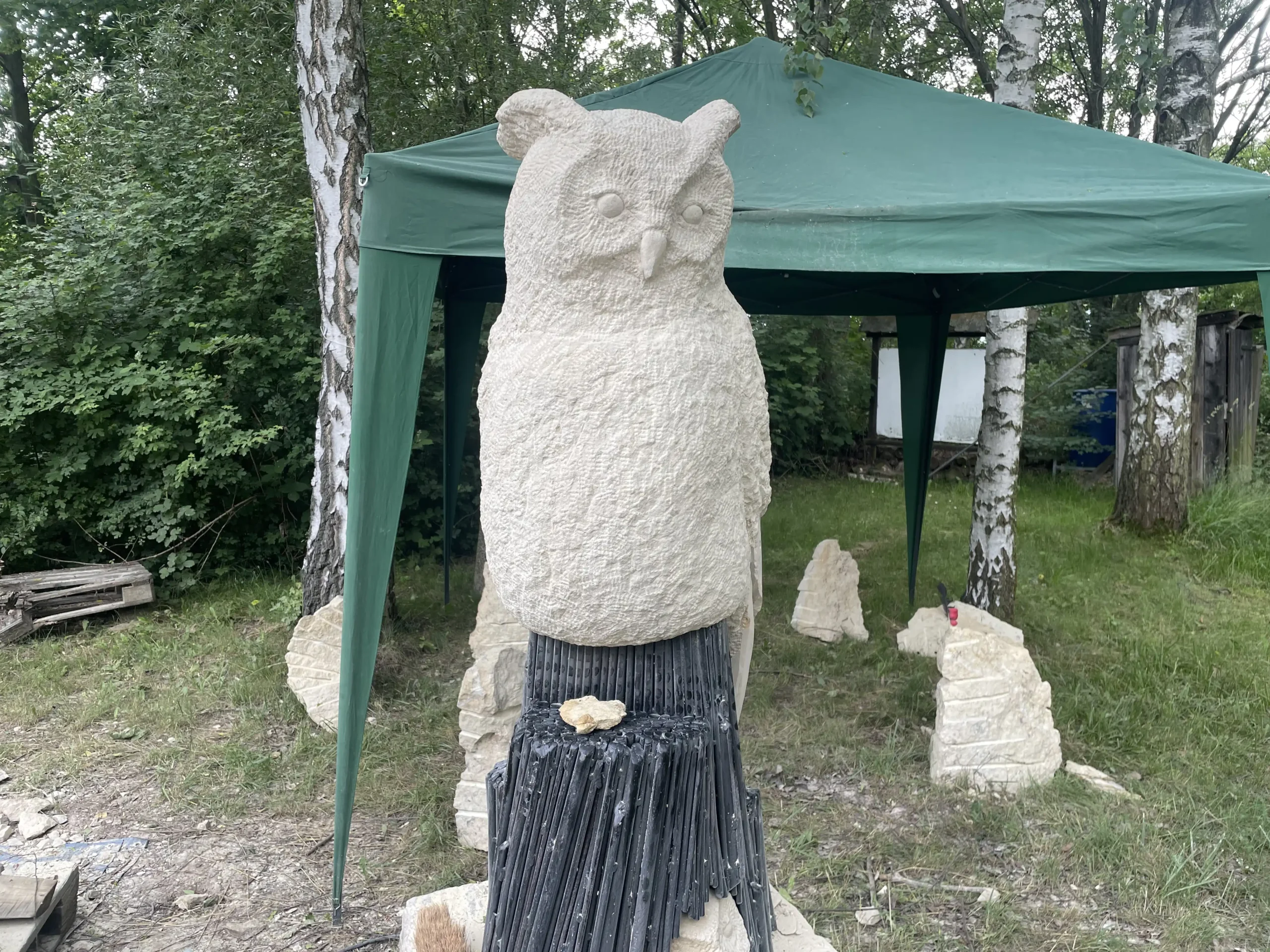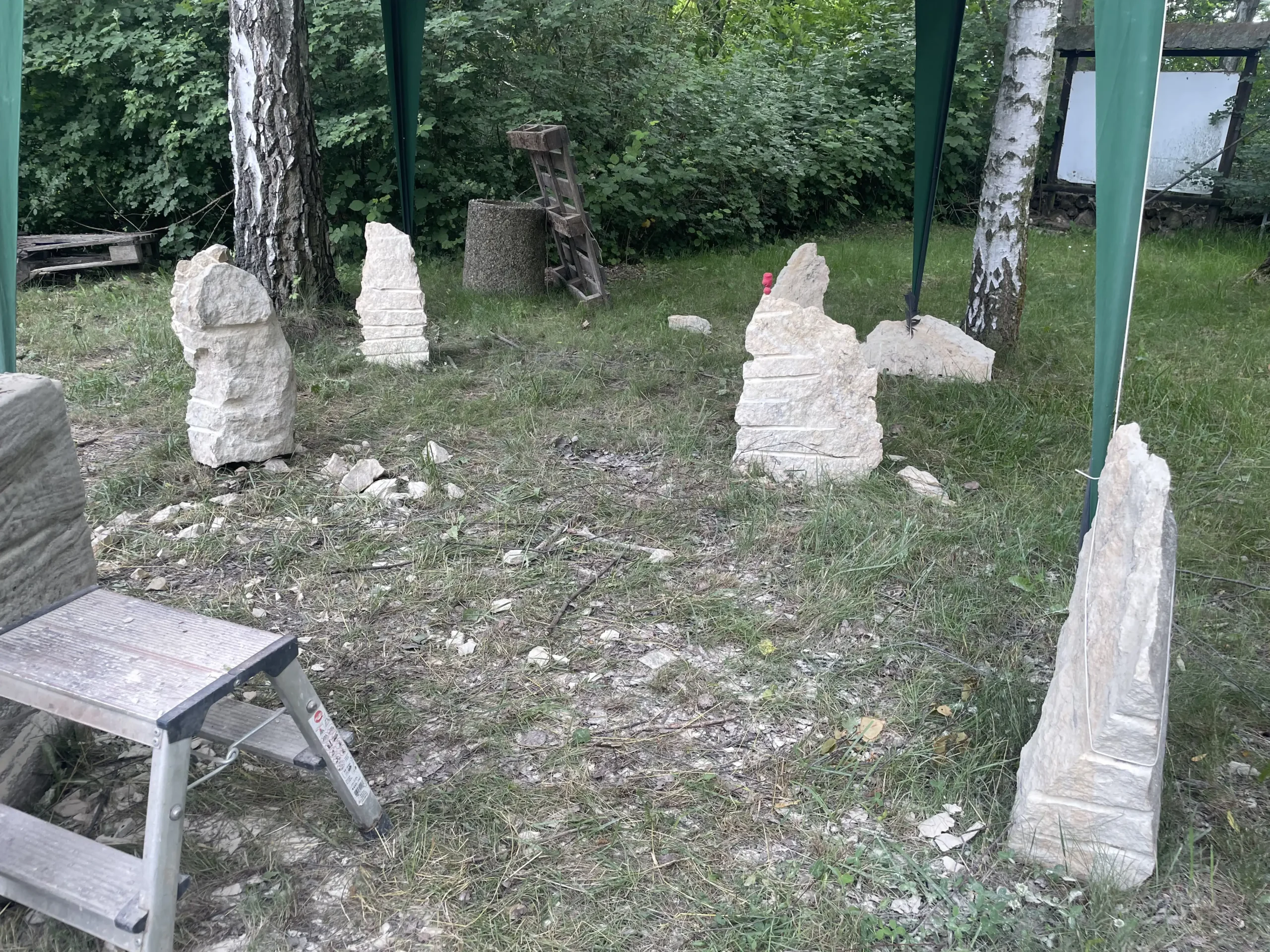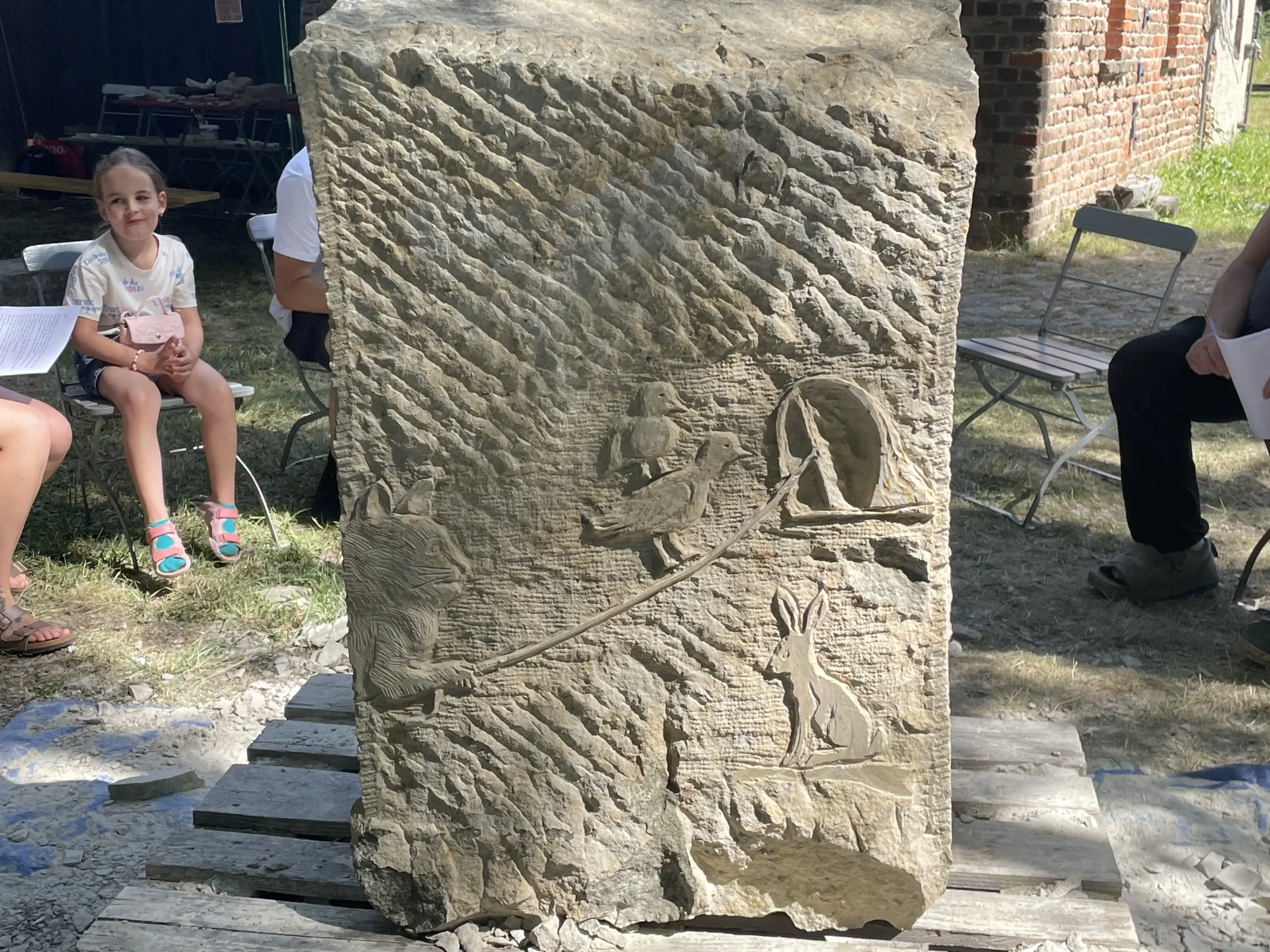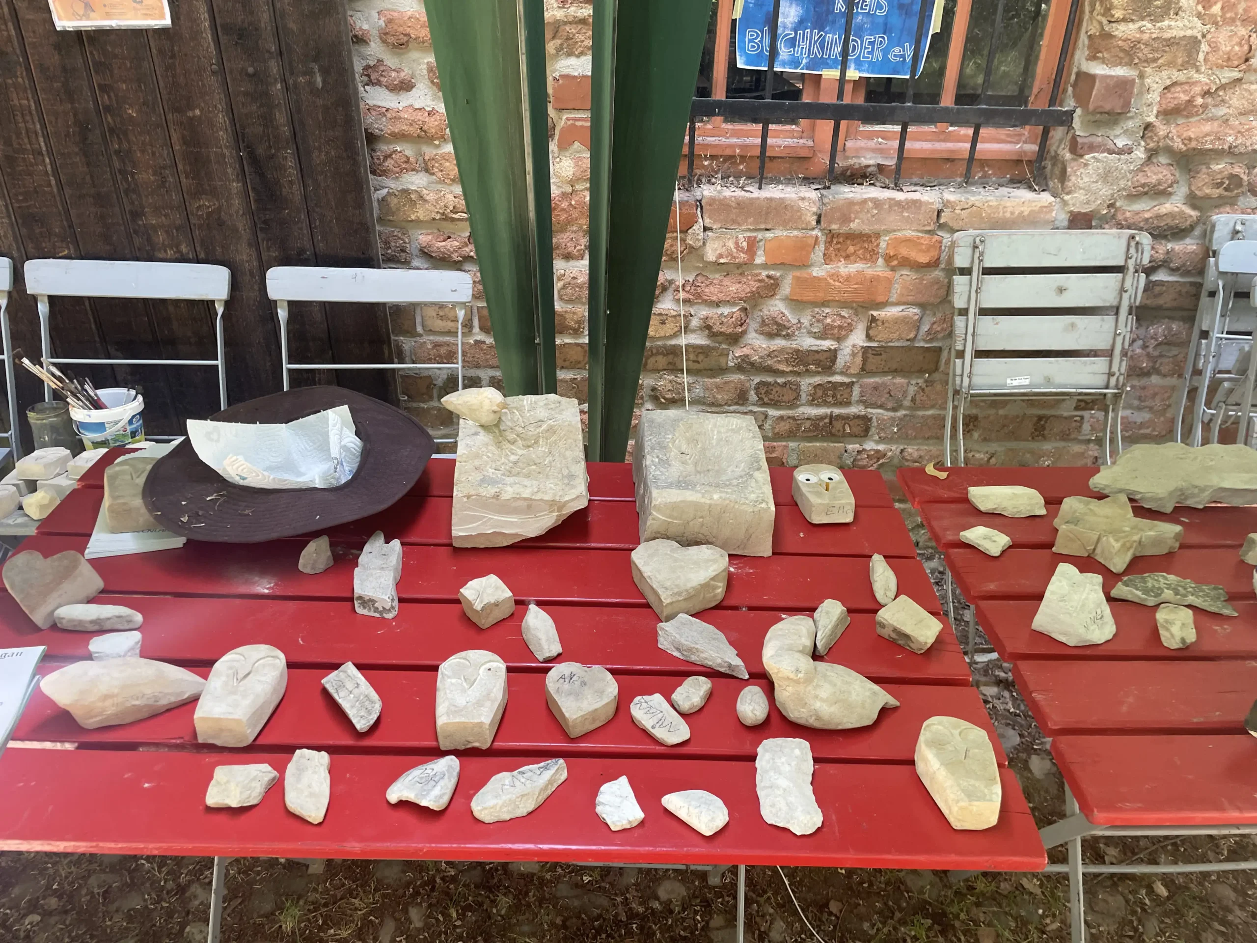 Eine ganze Woche lang verwöhnte uns das Wetter in der Alten Ziegelei mit Sonnenschein. Die Störche auf dem hohen Kamin klapperten mit ihren Schnäbeln den Takt zu den Hammerschlägen der kleinen und großen BildhauerInnen. Wir waren jeden Tag von 10-18 Uhr an diesem wunderbaren von hohen Bäumen beschatteten grünen Ort, wo alte von Hand ausgestrichene Ziegel in Trockenregalen lagerten und der langgestreckte Brennofen mit seinen Nischen den Kindern tolle Verstecke bot.