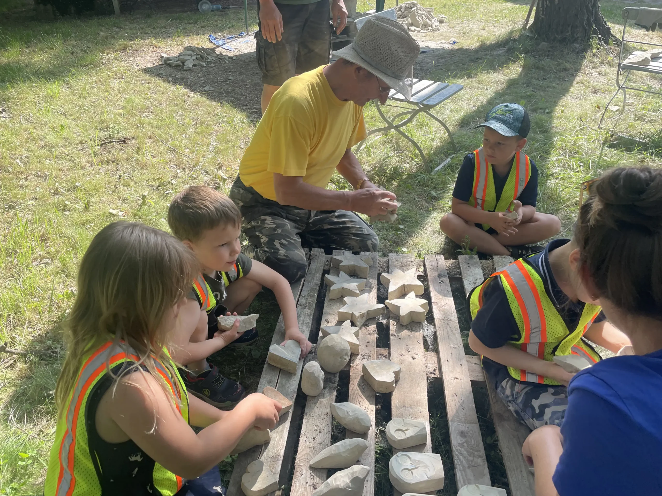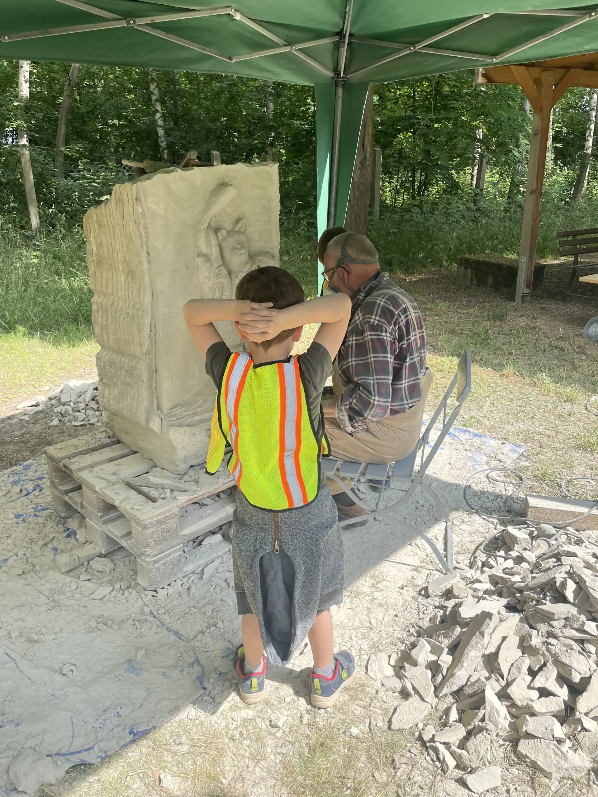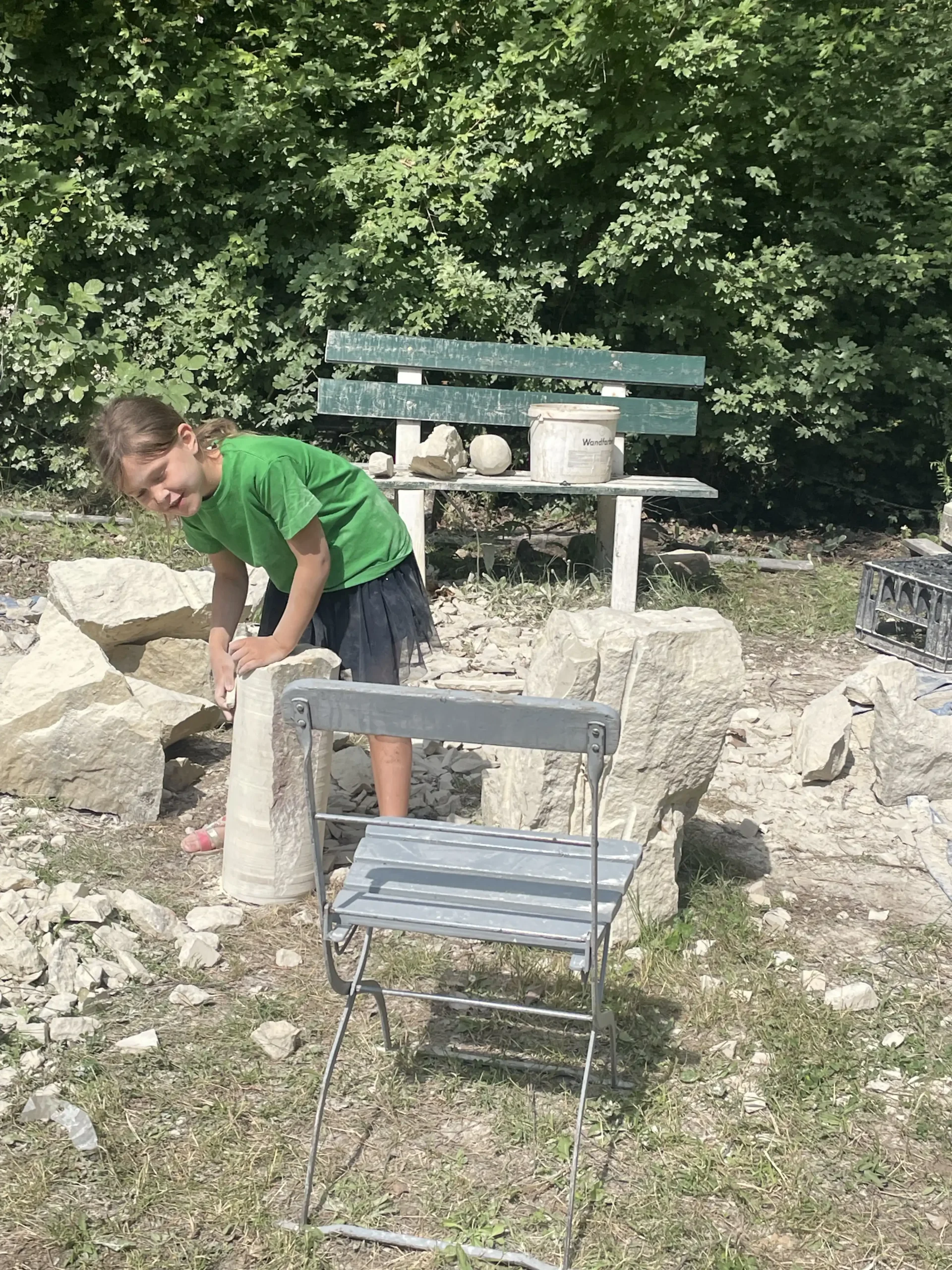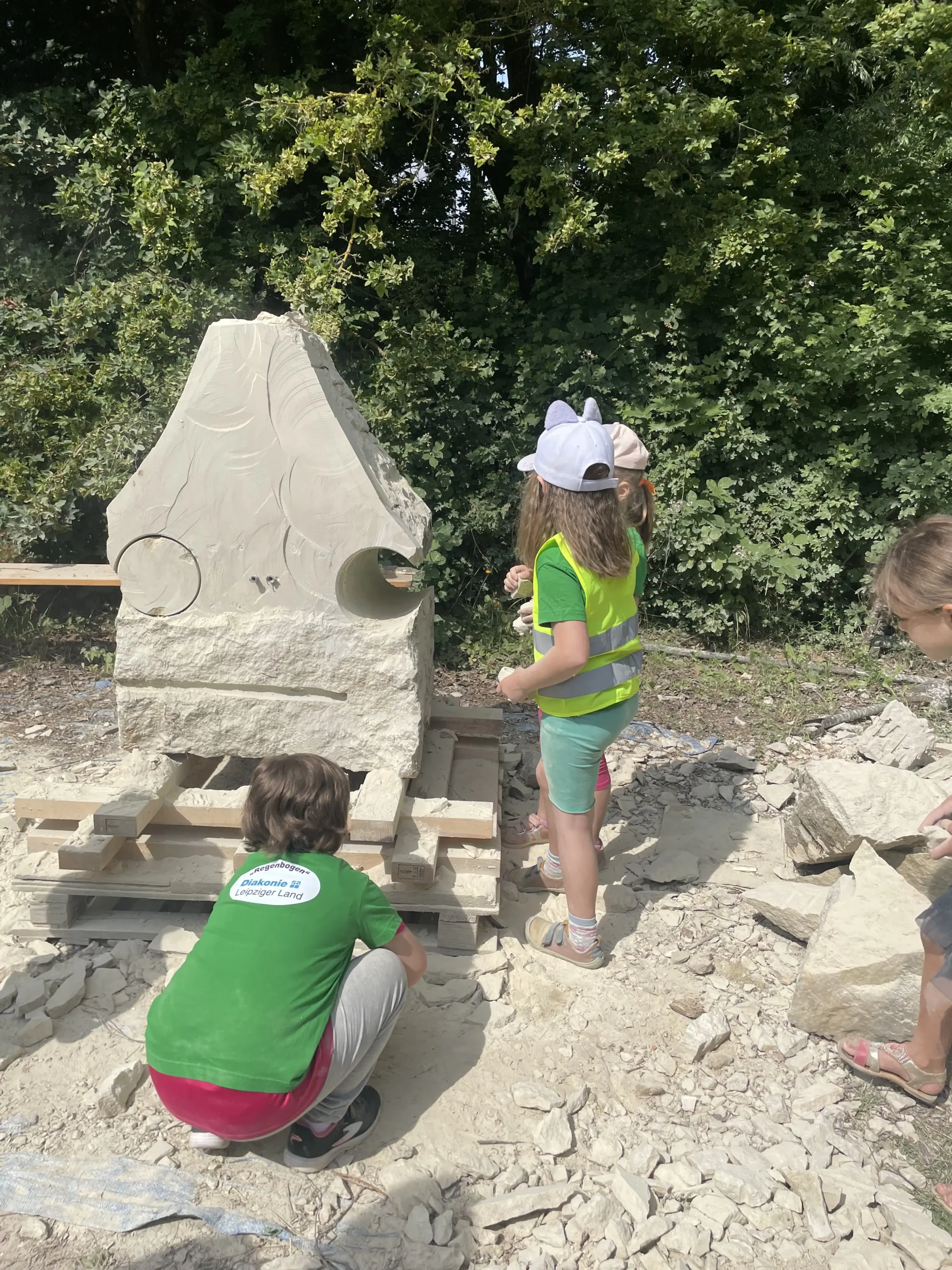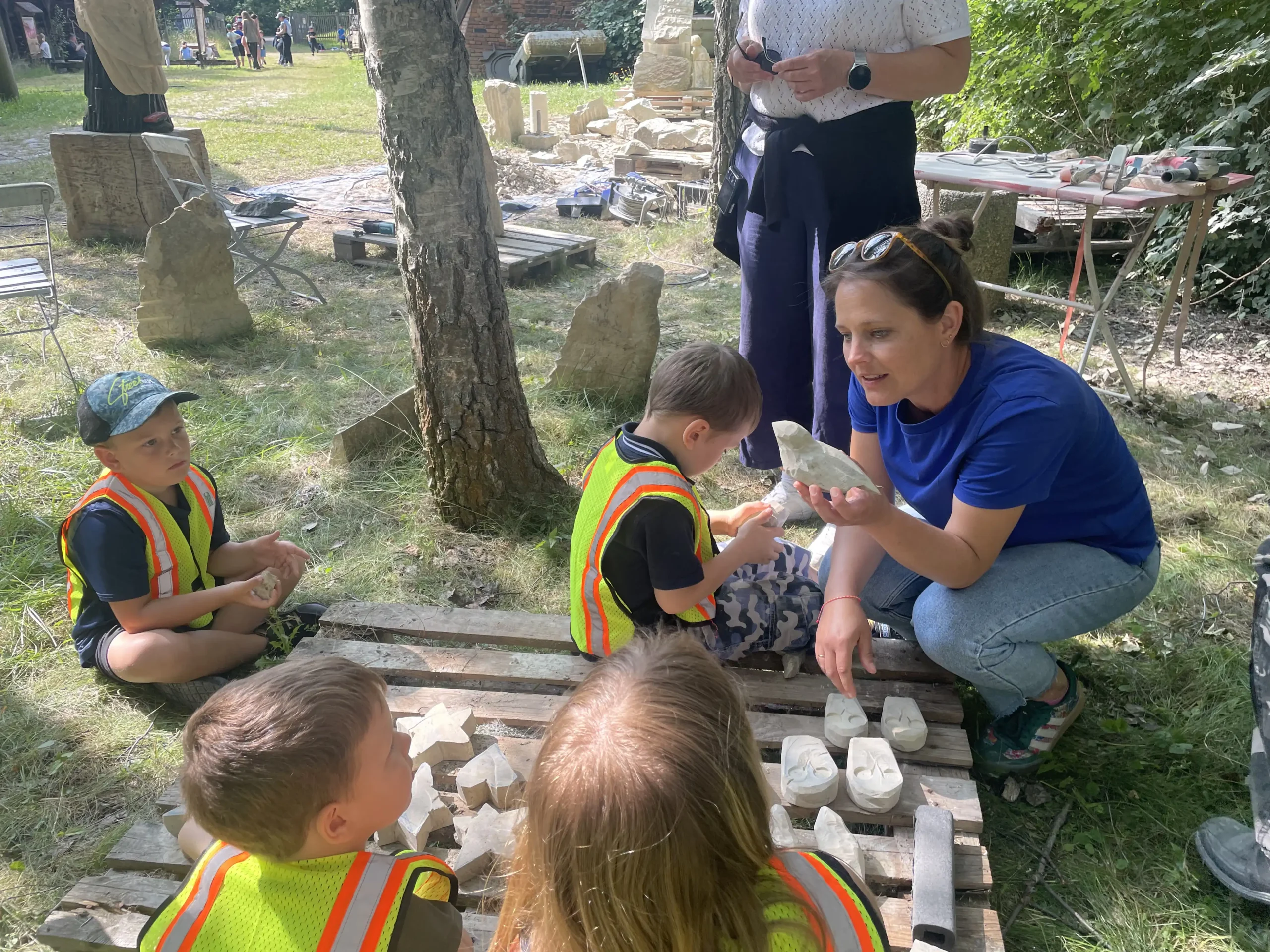 In der Pause schauten sie sich neugierig die Arbeiten der erwachsenen Bildhauer an und ließen sich erklären, wie die Profis mit Stein arbeiten. Ein entspannter, staubiger und sehr schöner Tag – mit vielen kleinen Kunstwerken und Begeisterung fürs Selbermachen!“