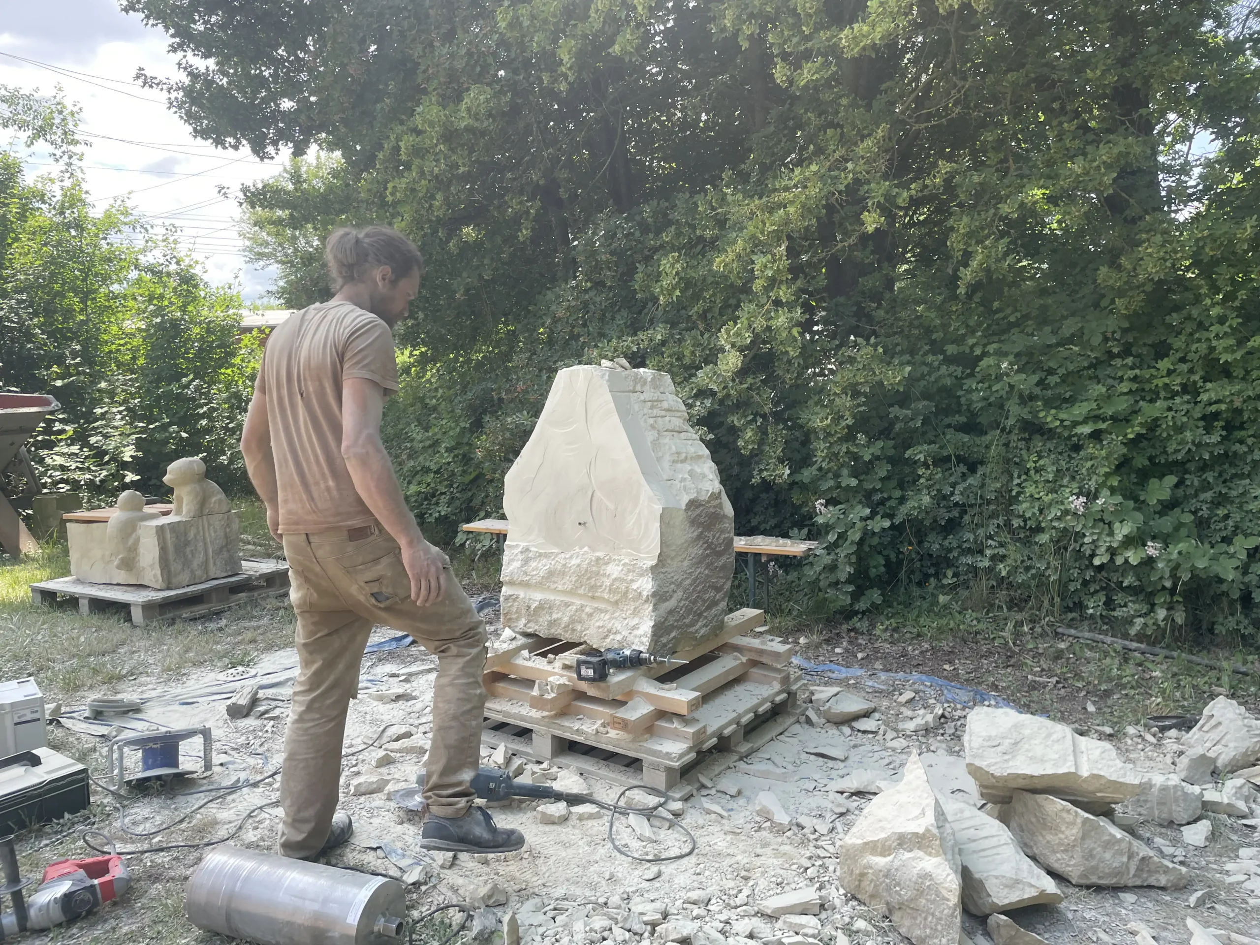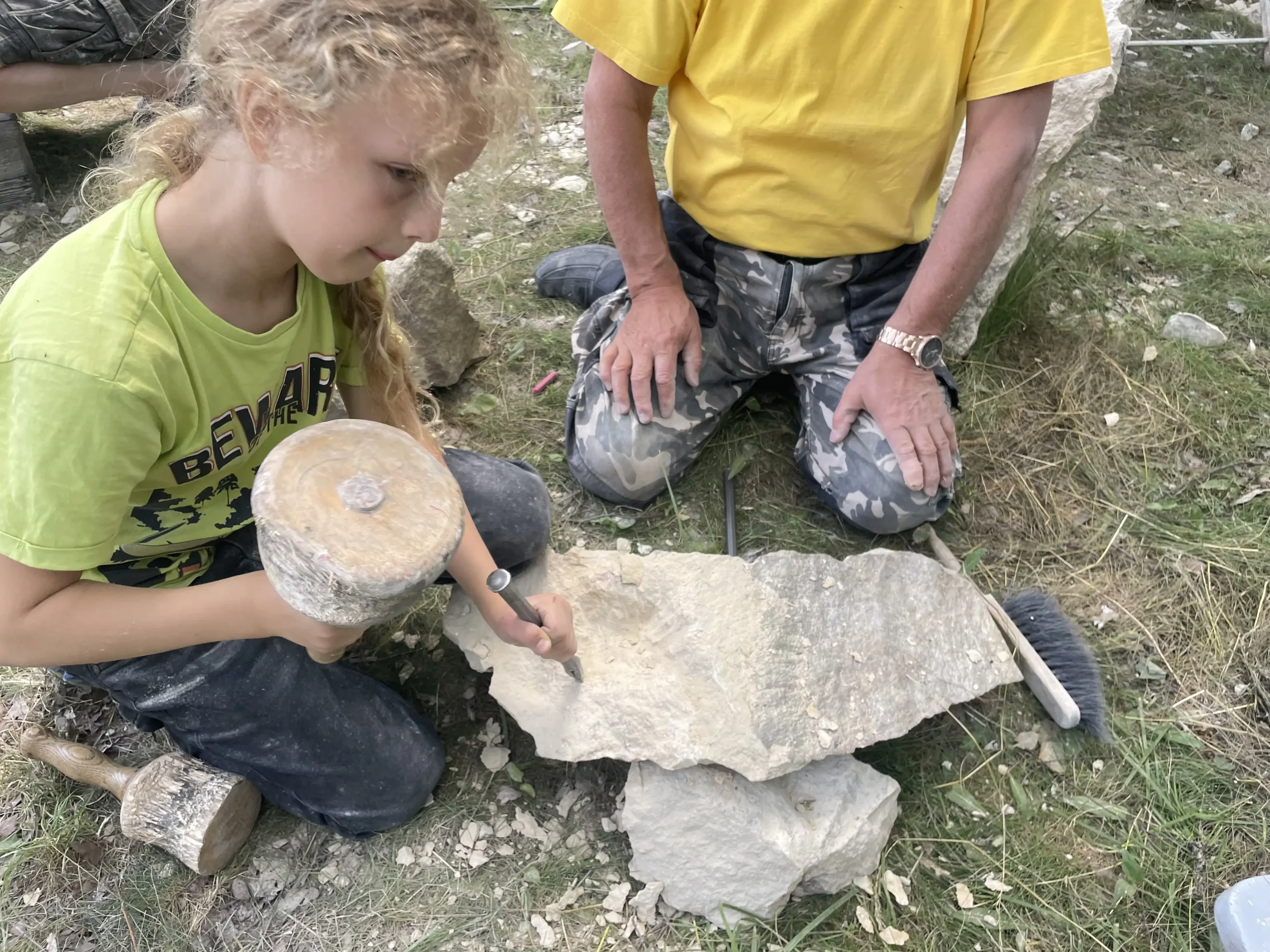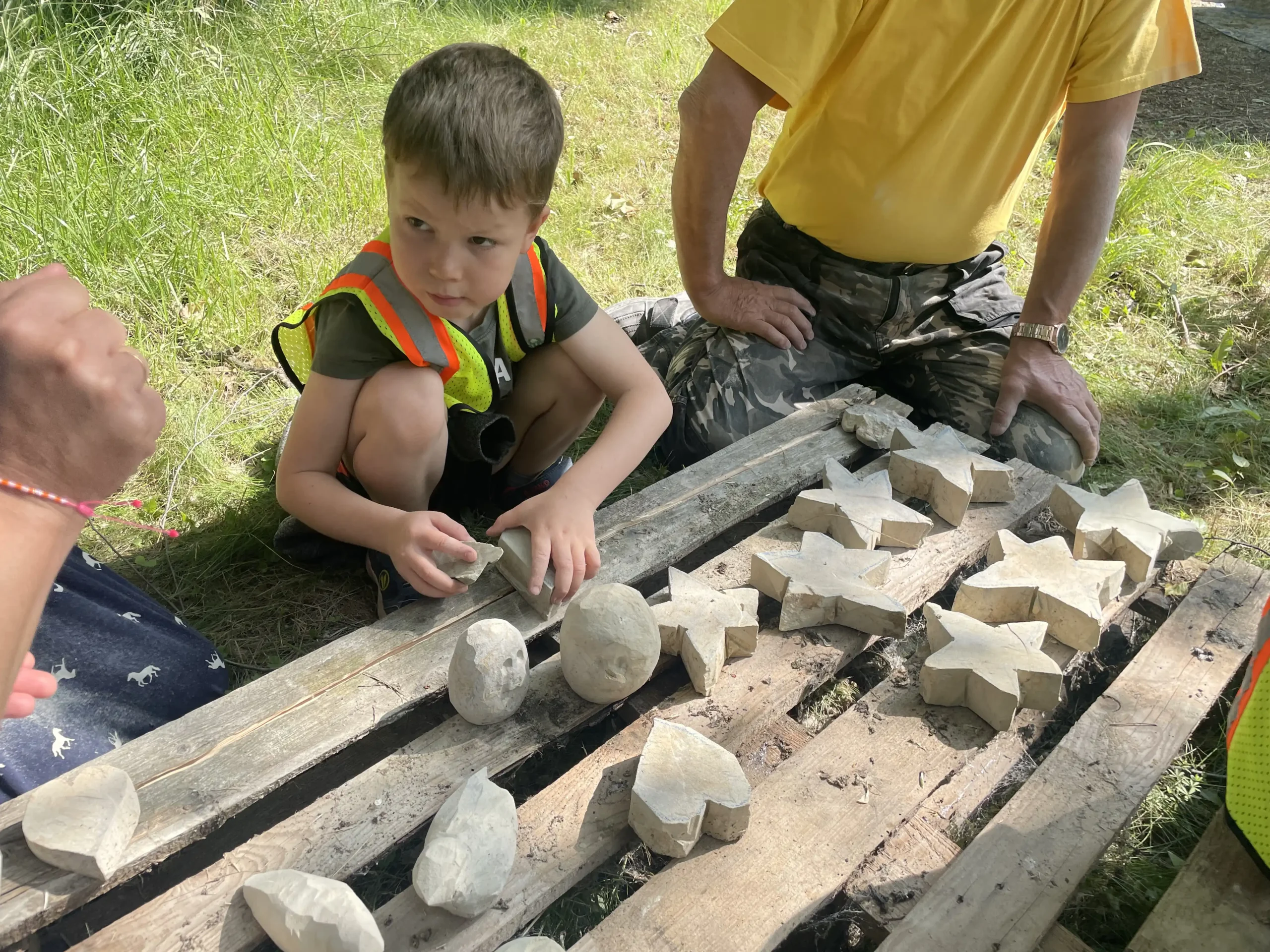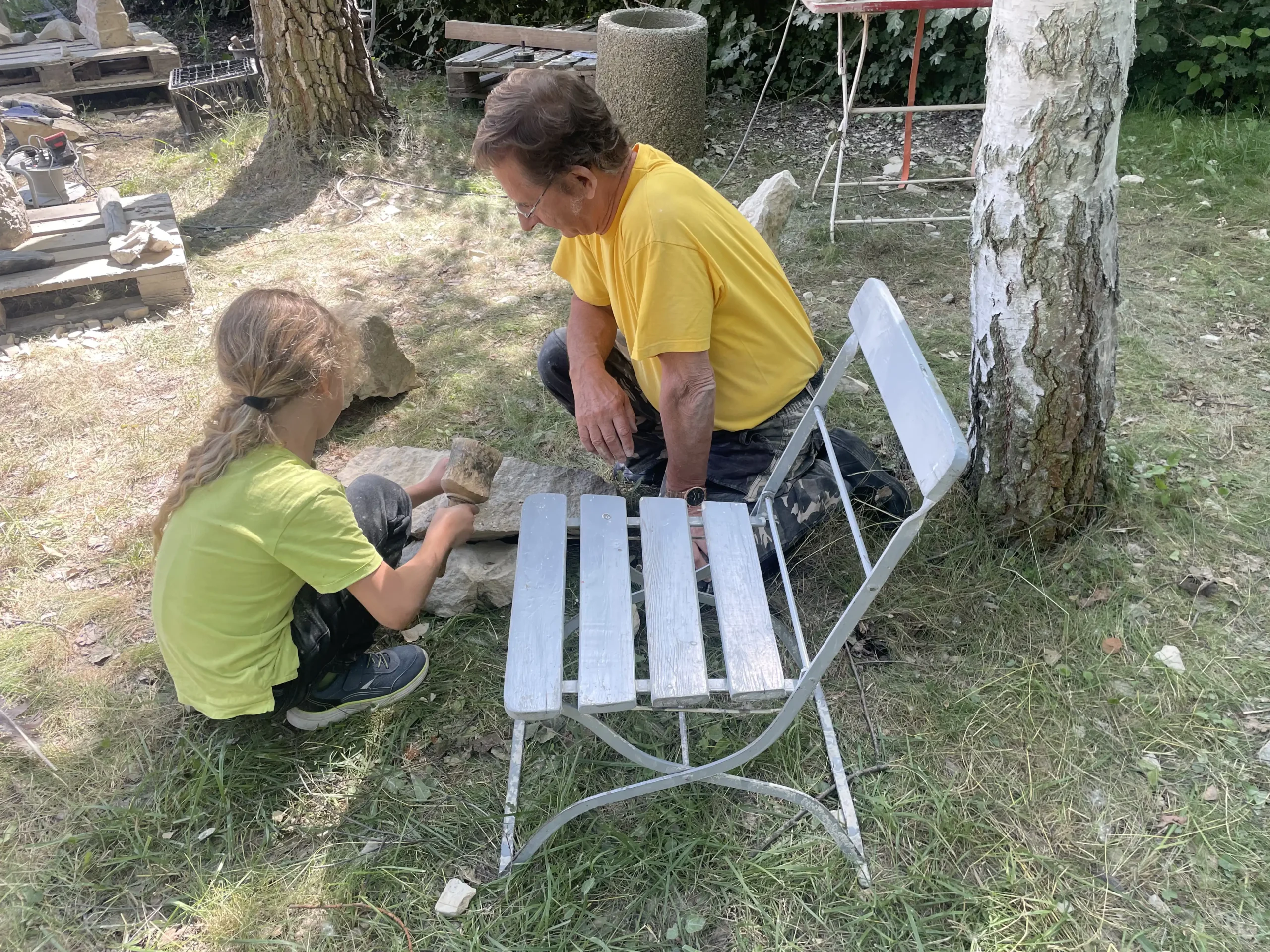 In der Pause schauten sie sich neugierig die Arbeiten der erwachsenen Bildhauer an und ließen sich erklären, wie die Profis mit Stein arbeiten. Ein entspannter, staubiger und sehr schöner Tag – mit vielen kleinen Kunstwerken und Begeisterung fürs Selbermachen!“