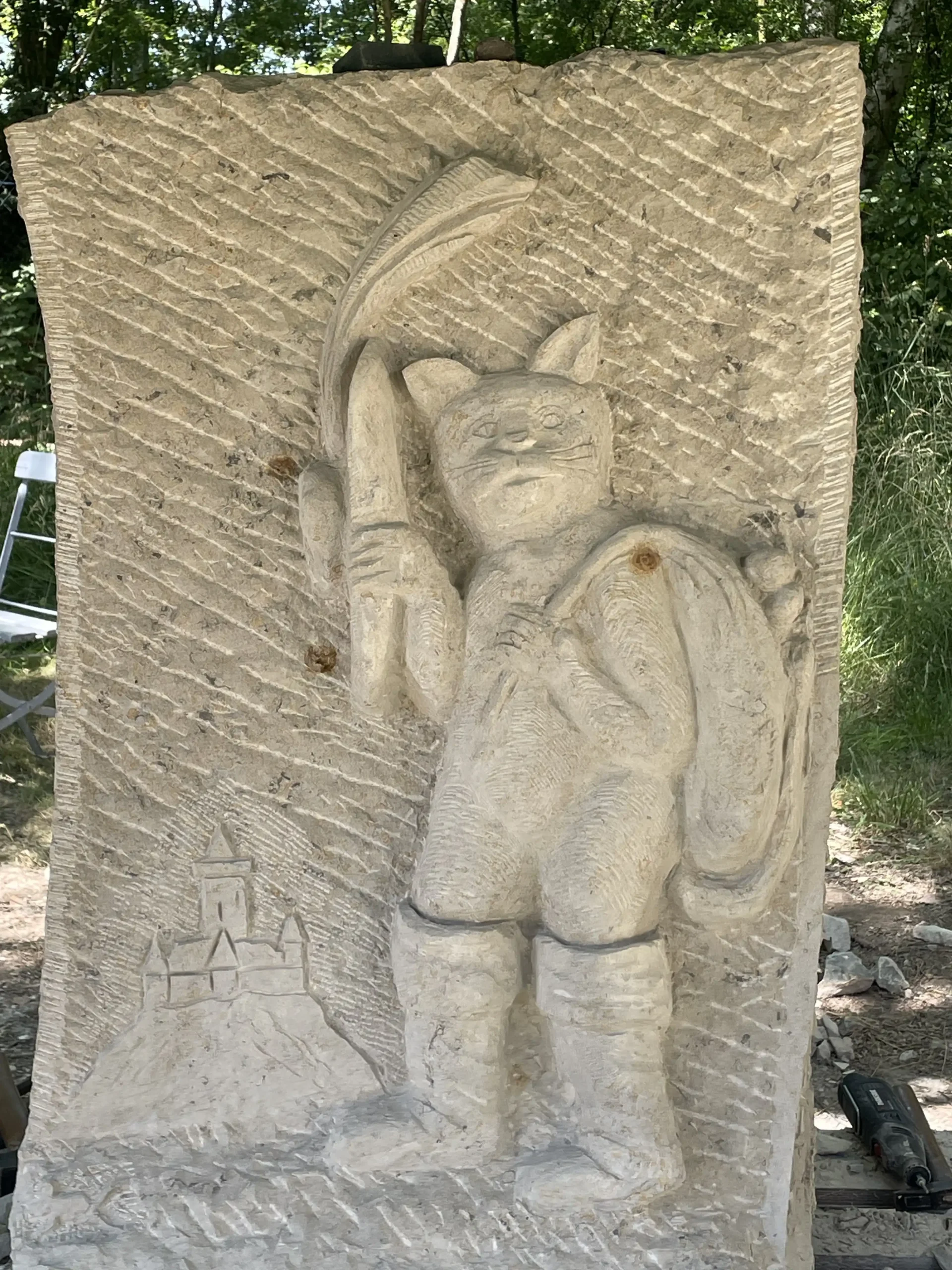 Zum Abschlussfest trug Christiane Neuhofer das ganze Märchen vom Gestiefelten Kater vor indem sie sich rings um die Skulptur bewegte. Denn alle typischen Szenen sind abgebildet. Eigentlich erzählt der Stein das Märchen selbst und die Kinder können alle Strukturen der Figuren mit den Händen ertasten. Besonderen Spaß machte es, die Maus zu finden, in die sich der böse Zauberer durch die List des Katers selbst verzaubert hatte, und die dann vom Kater verspeist wurde.