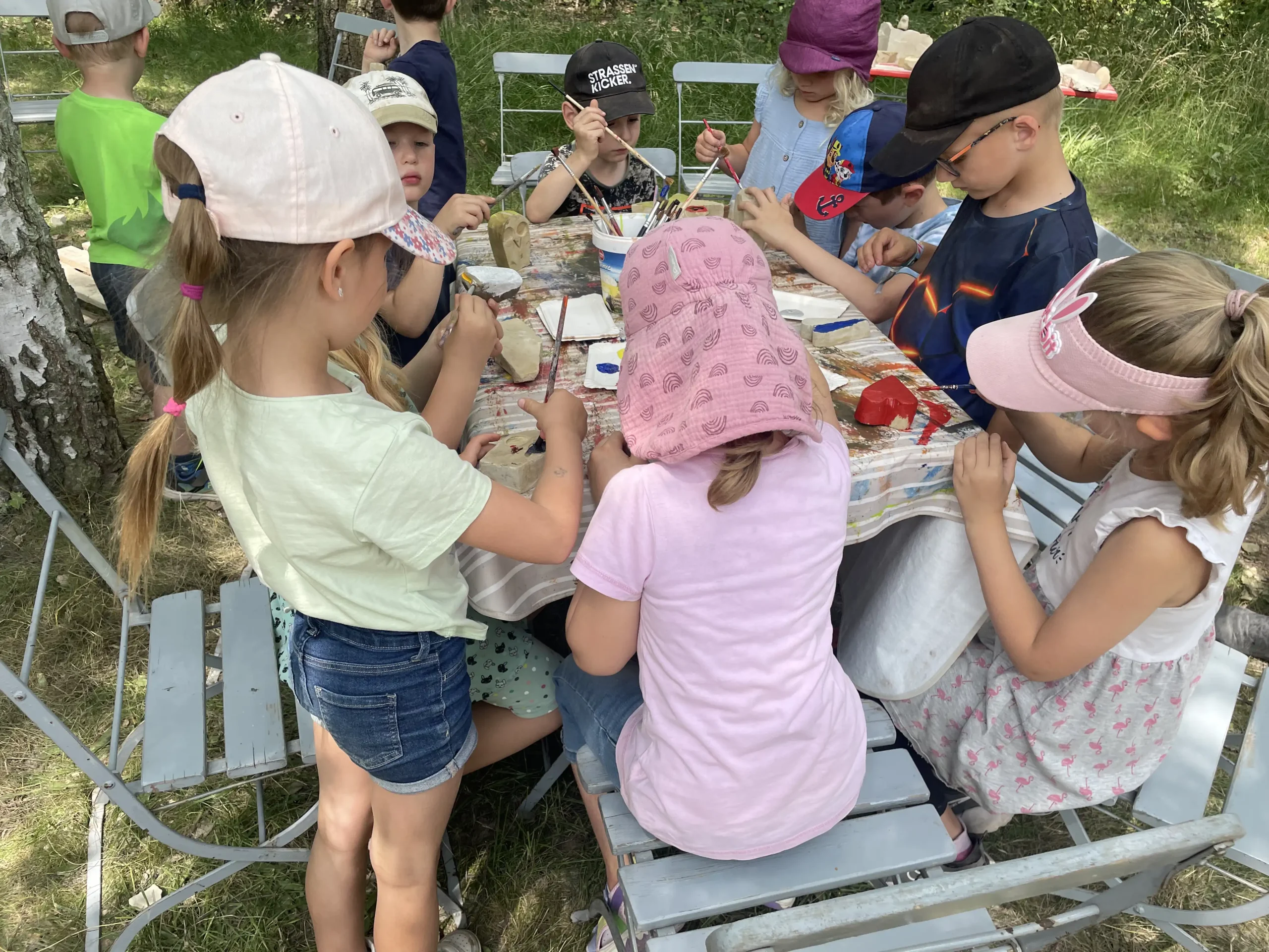 Schon am Morgen trudelten die Kinder neugierig ein und nach einer kurzen Begrüßung versammelten wir uns im gemütlichen Hof der Ziegelei. Jeder bekam ein eigenes Stück Stein – und dann ging’s auch schon los. Mit Hammer und Meißel wurde fleißig drauflos gehauen. Eine Mädchengruppe versuchte sich an einer Vogeltränke mit einem kleinen Vogel obendrauf – das große Loch in der Mitte entstand Schlag für Schlag.