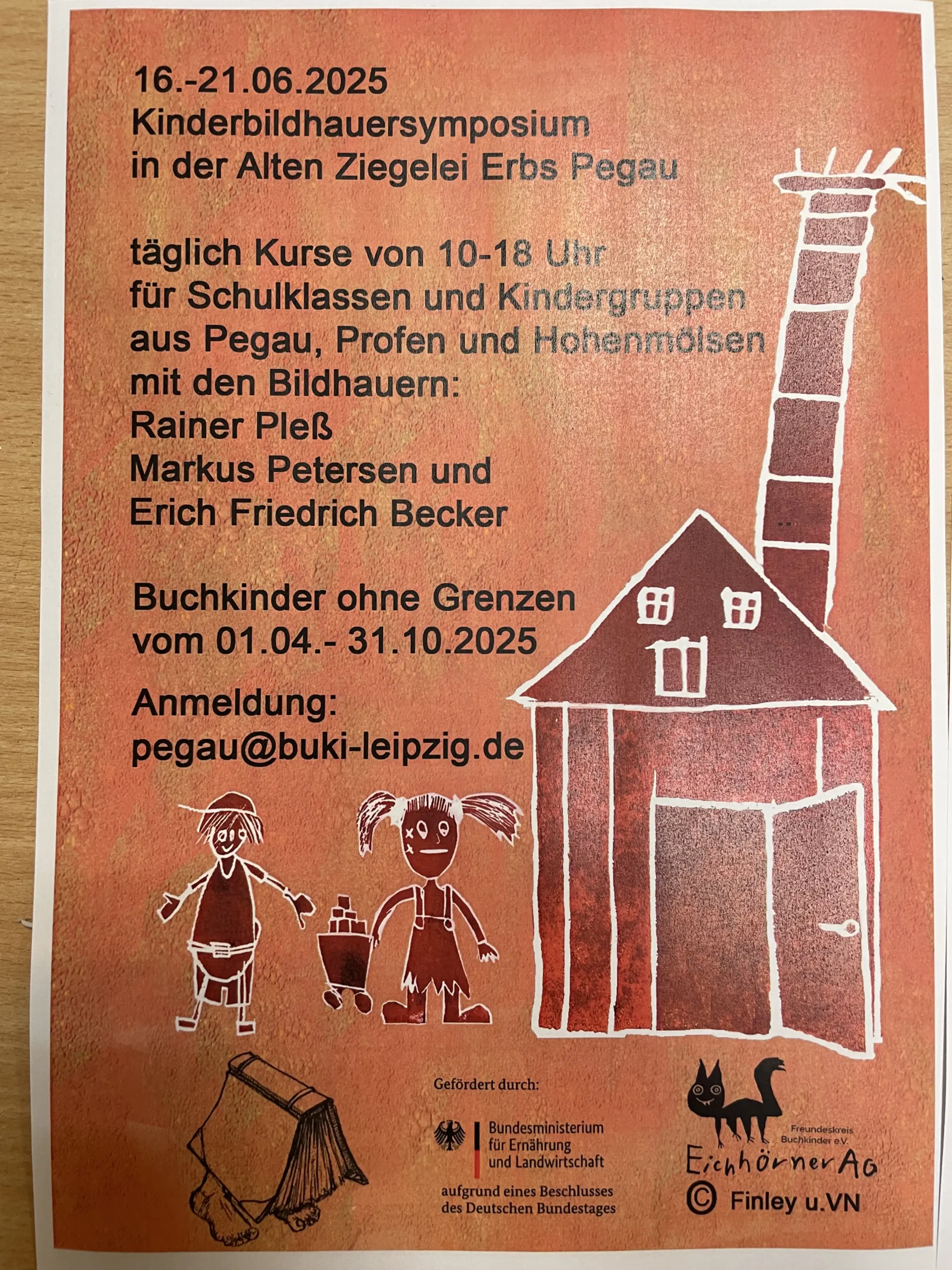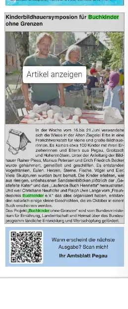 „Am 18. Juni wurde die Alte Ziegelei in Pegau zum Schauplatz des Bildhauer- Symposiums für eine Kindergruppe aus Hohenmölsen – begleitet wurden die Kinder vom Freundeskreis Buchkinder Pegau und ehrenamtlich unterstützenden Studentinnen.
