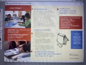 In Pegau sind wir seit 2018 in allen Kindergärten und Schulen bekannt. Unser Angebot wird regelmäßig nachgefragt. Alle Einrichtungen sind von der Buchkinderwerkstatt im Kulturladen fußläufig erreichbar. Vorschulkinder holen wir ab, oder besuchen sie in den Kitas.