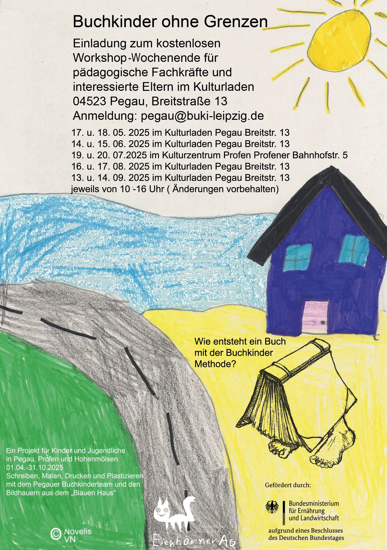 „Der Verein Freundeskreis Buchkinder bietet in Pegau viele Möglichkeiten kreativ mit Kindern zu arbeiten. Die Kinder haben die Gelegenheit ihre eigenen Geschichten zu schreiben und zu illustrieren. Am Ende werden die Geschichten gedruckt und zu Büchern gebunden.